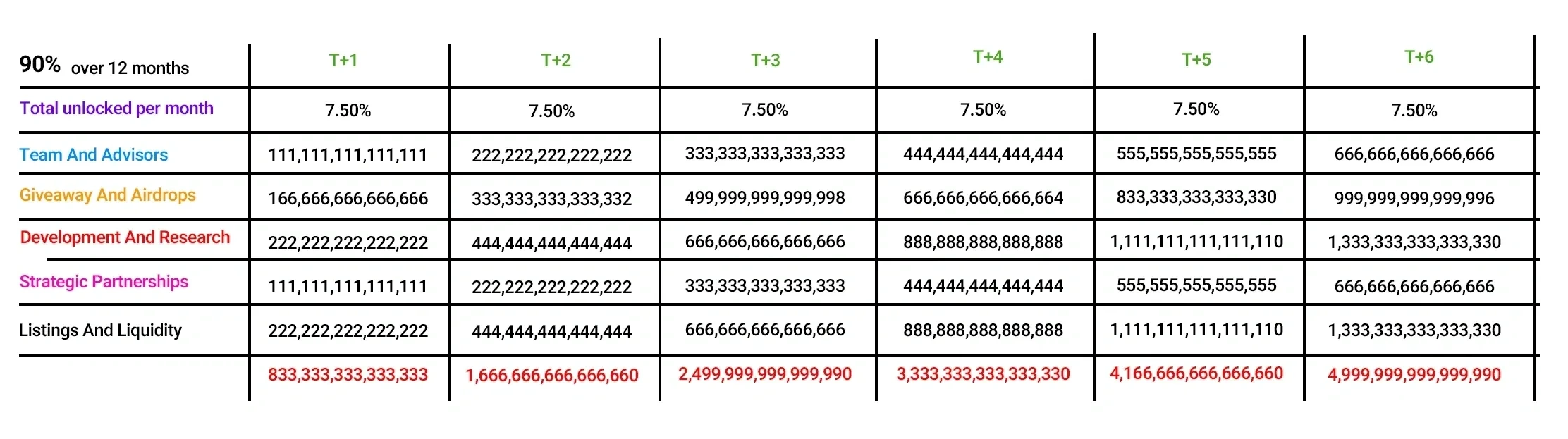 Month 1: 833,333,333,333,333 tokens released Month 2: 833,333,333,333,333 tokens released Month 3: 833,333,333,333,333 tokens released