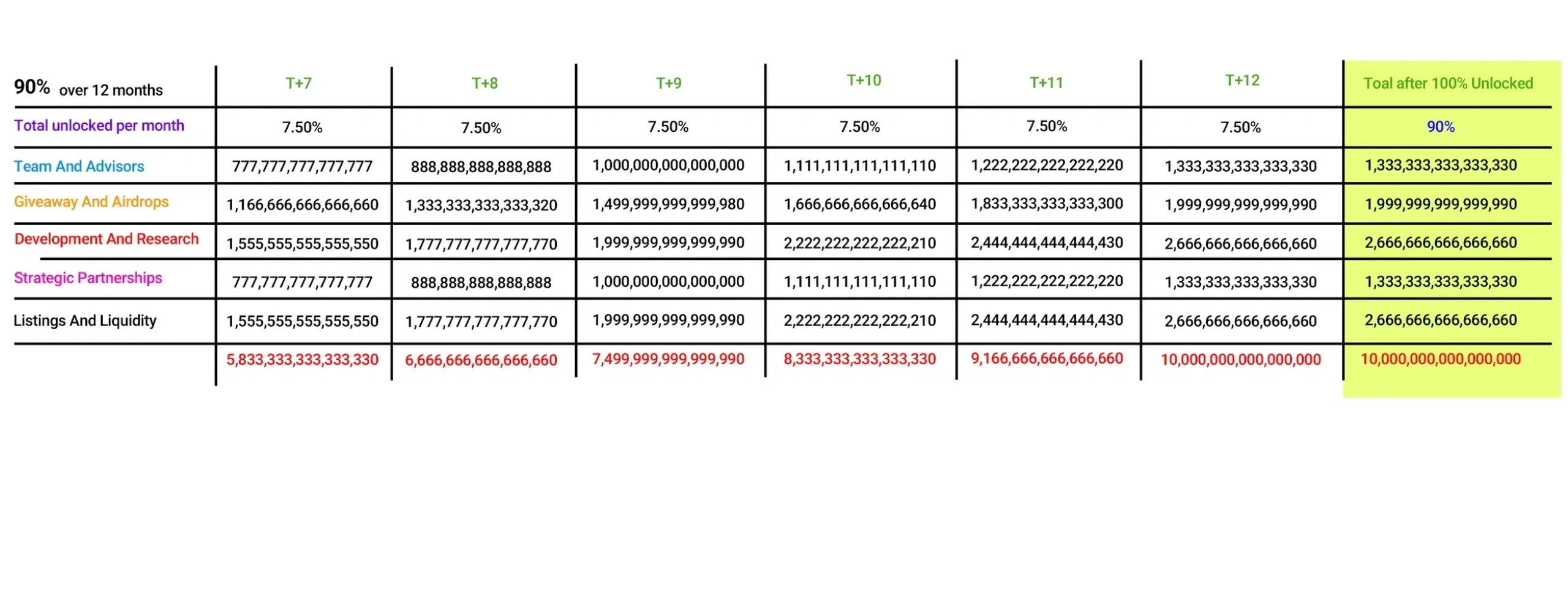 Ecosystem Development: 11,111,111,111,111 tokens (0.1% of total supply) Locked Tokens (90%): 90% of total supply: 10,000,000,000,000,000 tokens Vesting Plan: Tokens are locked and subject to a vesting period over 12 months. Each month, a portion of the locked tokens
